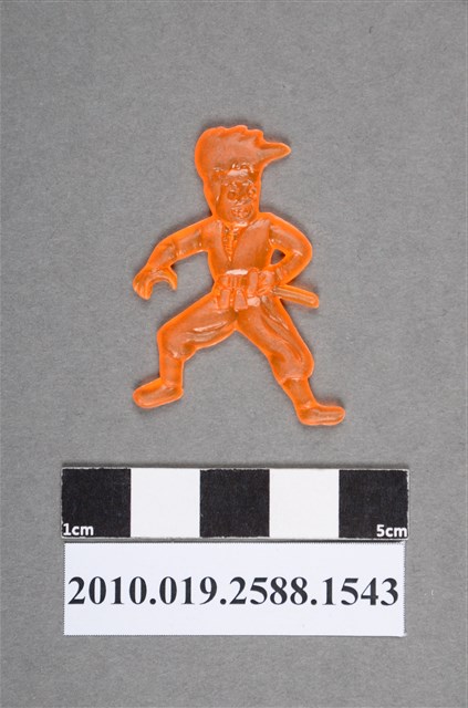 1.本物件為持劍人型尪仔仙。硬質塑膠材質,扁平,單一橘色,雙面浮雕圖案,兩面圖案相同。圖案為站立男性,髮型斜向一邊,身穿背心式功夫服,腰間繫有腰帶,一手裡握住劍鞘,另一隻手張開,似要拉出劍。2.尪仔仙尺寸大致可分成小、中、大型,小型約長2-5公分,中型約長8-15公分,顏色以單色為主。有些大型的則可長達30公分左右,以菩薩、神仙和民間傳說故事人物等造型為主,塗上金銀紅黃彩漆等亮色。1960、70年代的尪仔仙多以民間傳說故事、歌仔戲、布袋戲人物為造型。1980年代改以卡通、電玩、漫畫人物造型為主。常見玩法之一為兩人(或多人)各持一只尪仔仙,輪流用手指彈射,看誰的尪仔仙先疊在對方上面,便可贏得對方用來對戰或是約定的尪仔仙。