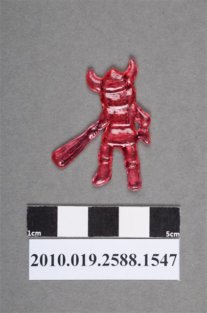 1.本物件為卡通北海小英雄之小威尪仔仙。硬質塑膠材質,扁平,單一紅色,雙面浮雕圖案。正面圖案為頭戴維京人帽子,腳穿靴子,左手拿棒子之男孩貌。