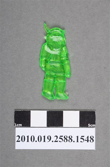 1.本物件為綠色人型尪仔仙。硬質塑膠材質,扁平,單一綠色,雙面浮雕圖案。正面圖案為戴著頭盔,頭盔上有角,臉部無法辨識,一手戴有手套,另一手不見手掌,穿著靴子之人型。