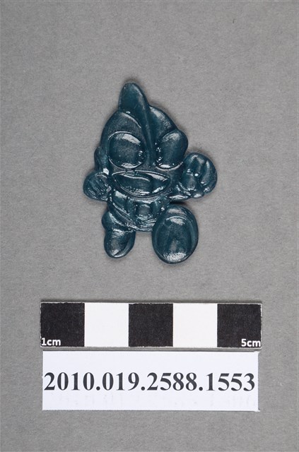 1.本物件為電視影集超人力霸王(奧特曼、鹹蛋超人)之奧特曼尪仔仙。硬質塑膠材質,扁平,單一不透明靛色,雙面浮雕圖案,兩面圖案相同。圖案為Q版奧特曼,張嘴,有橢圓形眼睛,頭罩上有立體彎月形造型,兩手握拳,雙腳呈跑步貌。