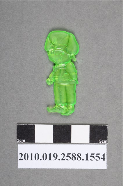 1.本物件為中東服裝人型尪仔仙。硬質塑膠材質,扁平,單一綠色,雙面浮雕圖案。正面圖案為中東服裝打扮的男孩,頭上包有包巾,包巾中間有裝飾,張嘴而笑,身上穿有背心,腳穿尖頭鞋。