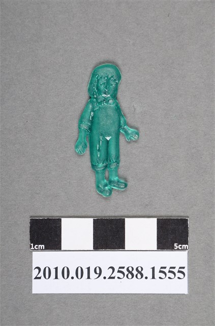 1.本物件為吊帶褲人型尪仔仙。硬質塑膠材質,扁平,單一綠色,雙面浮雕圖案,兩面圖案相同。圖案為穿著吊帶褲的女孩,為站姿,髮型為長度在肩膀下,有部分頭髮編為辮子,有瀏海。其雙手放在身旁,無特殊動作。