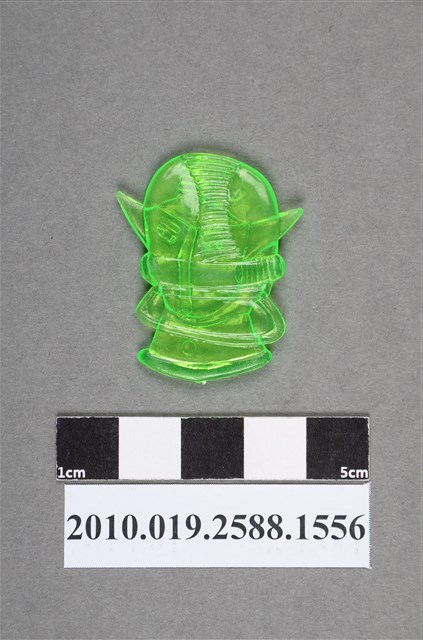 1.本物件為頭盔頭像尪仔仙。硬質塑膠材質,扁平,單一綠色,雙面浮雕圖案。正面圖案為戴著面具型頭盔遮住全頭部,兩側太陽穴有突出尖角裝飾,橫型構件蓋住臉頰和鼻子之包括脖子部分頭像。