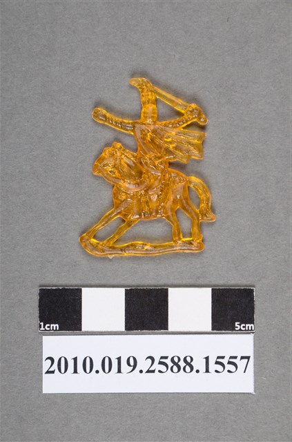 1.本物件為騎馬人型尪仔仙。硬質塑膠材質,扁平,單一橙色,雙面浮雕圖案。正面圖案為戰士騎在馬上。戰士身穿鎧甲,有披風,戴有頭盔,頭盔頂上有立起來的裝飾,右手拿著劍型武器,左手往外伸。馬匹有韁繩和馬鞍,4個馬蹄連在橫桿上。