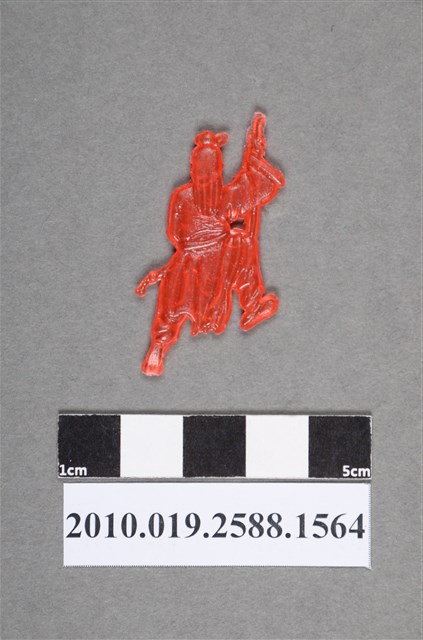 1.本物件為持劍人型尪仔仙。硬質塑膠材質,扁平,單一紅色,雙面浮雕圖案。正面圖案為穿著中國古裝寬袖長袍之人型,無法判斷性別,頭上綁有髮髻。其姿勢為雙手上下握住劍型物品,右腳抬起。