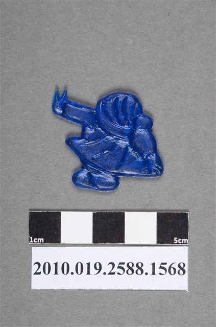 1.本物件為頭巾人型尪仔仙。硬質塑膠材質,扁平,單一藍色,雙面浮雕圖案。正面圖案為奔跑的人型,頭部綁了頭巾,蒙住頭頂和臉頰,鼻子比例大呈橢圓形。其左手向後伸展,衣服有飛揚感,右腳伸直,左腳向後彎,呈快速奔跑之貌。2.尪仔仙尺寸大致可分成小、中、大型,小型約長2-5公分,中型約長8-15公分,顏色以單色為主。有些大型的則可長達30公分左右,以菩薩、神仙和民間傳說故事人物等造型為主,塗上金銀紅黃彩漆等亮色。1960、70年代的尪仔仙多以民間傳說故事、歌仔戲、布袋戲人物為造型。1980年代改以卡通、電玩、漫畫人物造型為主。常見玩法之一為兩人(或多人)各持一只尪仔仙,輪流用手指彈射,看誰的尪仔仙先疊在對方上面,便可贏得對方用來對戰或是約定的尪仔仙。