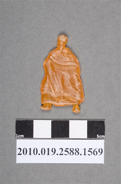 1.本物件為大袍人型尪仔仙。硬質塑膠材質,扁平,單一黃色,雙面浮雕圖案。正面圖案為站立男性人型,整個身體包括雙手被大袍包住,可見大袍之皺褶。2.尪仔仙尺寸大致可分成小、中、大型,小型約長2-5公分,中型約長8-15公分,顏色以單色為主。有些大型的則可長達30公分左右,以菩薩、神仙和民間傳說故事人物等造型為主,塗上金銀紅黃彩漆等亮色。1960、70年代的尪仔仙多以民間傳說故事、歌仔戲、布袋戲人物為造型。1980年代改以卡通、電玩、漫畫人物造型為主。常見玩法之一為兩人(或多人)各持一只尪仔仙,輪流用手指彈射,看誰的尪仔仙先疊在對方上面,便可贏得對方用來對戰或是約定的尪仔仙。