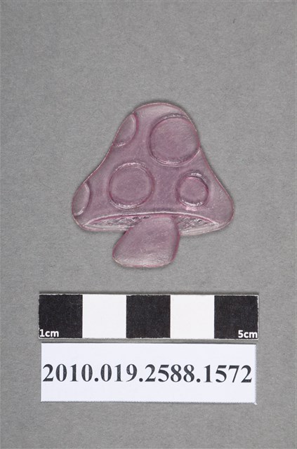 1.本物件為超級瑪利歐兄弟(超級瑪利)之蘑菇尪仔仙。硬質塑膠材質,扁平,單一紫色,雙面浮雕圖案,兩面圖案相同。圖案為蕈帽上有5個疣點,底下可見蕈摺,有蕈柄。在電玩中,瑪利歐吃到蘑菇可獲得神力。