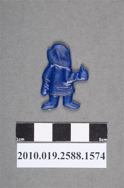 1.本物件為比讚人型尪仔仙。硬質塑膠材質,扁平,單一藍色,雙面浮雕圖案。正面圖案為站立男性,耳朵比例大,形狀特殊,呈尖形,鼻子為圓形。其右手大拇指翹起來,比出讚的手勢,左手自然垂放。2.尪仔仙尺寸大致可分成小、中、大型,小型約長2-5公分,中型約長8-15公分,顏色以單色為主。有些大型的則可長達30公分左右,以菩薩、神仙和民間傳說故事人物等造型為主,塗上金銀紅黃彩漆等亮色。1960、70年代的尪仔仙多以民間傳說故事、歌仔戲、布袋戲人物為造型。1980年代改以卡通、電玩、漫畫人物造型為主。常見玩法之一為兩人(或多人)各持一只尪仔仙,輪流用手指彈射,看誰的尪仔仙先疊在對方上面,便可贏得對方用來對戰或是約定的尪仔仙。