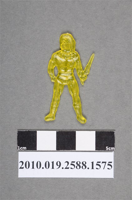 1.本物件為持劍人型尪仔仙。硬質塑膠材質,扁平,單一黃色,雙面浮雕圖案。正面圖案為站立人型,胸前有V形裝飾,可見其胸部和大腿肌肉線條,腹部有圓形圖案,穿著靴子,其右手握有劍型武器。2.尪仔仙尺寸大致可分成小、中、大型,小型約長2-5公分,中型約長8-15公分,顏色以單色為主。有些大型的則可長達30公分左右,以菩薩、神仙和民間傳說故事人物等造型為主,塗上金銀紅黃彩漆等亮色。1960、70年代的尪仔仙多以民間傳說故事、歌仔戲、布袋戲人物為造型。1980年代改以卡通、電玩、漫畫人物造型為主。常見玩法之一為兩人(或多人)各持一只尪仔仙,輪流用手指彈射,看誰的尪仔仙先疊在對方上面,便可贏得對方用來對戰或是約定的尪仔仙。