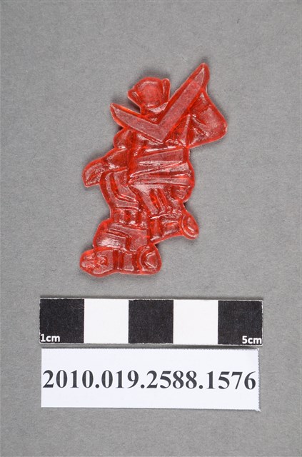 1.本物件為卡通聖戰士(百獸王)之聖戰士尪仔仙。硬質塑膠材質,扁平,單一黃色,雙面浮雕圖案。正面圖案為機器人型,其背後有V字裝飾,其手與腳可見獅頭造型。