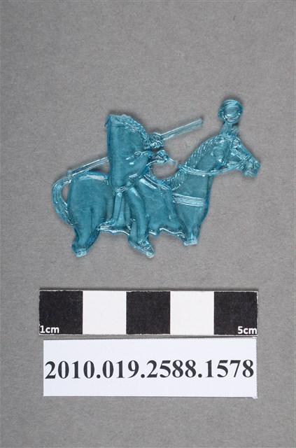 1.本物件為騎馬人型尪仔仙。硬質塑膠材質,扁平,單一藍色,雙面浮雕圖案,兩面圖案相同。尪仔仙有破損,人物頭、武器和馬腳斷掉。人物騎於馬上,為中國古代服飾,武器為棍型,頂端有球體,馬有韁繩與馬鞍。