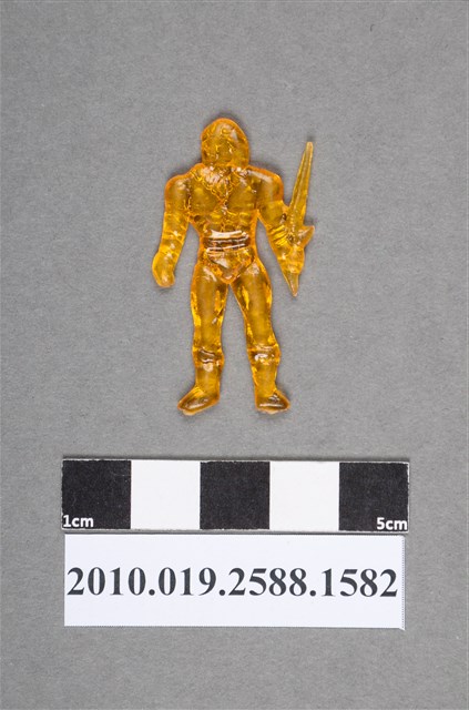 1.本物件為持劍人型尪仔仙。硬質塑膠材質,扁平,單一橙色,雙面浮雕圖案。正面圖案為站立人型,裝扮有腰帶和靴子,可見其胸部和大腿肌肉線條,其右手握有劍型武器,左手垂放。2.尪仔仙尺寸大致可分成小、中、大型,小型約長2-5公分,中型約長8-15公分,顏色以單色為主。有些大型的則可長達30公分左右,以菩薩、神仙和民間傳說故事人物等造型為主,塗上金銀紅黃彩漆等亮色。1960、70年代的尪仔仙多以民間傳說故事、歌仔戲、布袋戲人物為造型。1980年代改以卡通、電玩、漫畫人物造型為主。常見玩法之一為兩人(或多人)各持一只尪仔仙,輪流用手指彈射,看誰的尪仔仙先疊在對方上面,便可贏得對方用來對戰或是約定的尪仔仙。