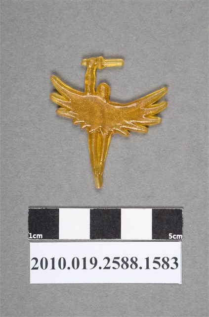 1.本物件為卡通科學小飛俠之鐵雄尪仔仙。硬質塑膠材質,扁平,單一黃色,內嵌金粉,雙面浮雕圖案。正面圖案為飛起來的鐵雄,鳥羽狀披風張開揚起,左手高舉著劍型武器,兩腳併攏。