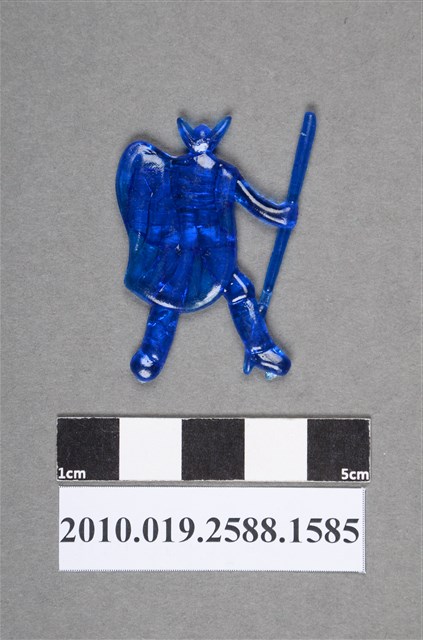 1.本物件為持棍盾人型尪仔仙。硬質塑膠材質,扁平,單一藍色,雙面浮雕圖案。正面圖案為站立人型,頭部兩側有明顯凸起物,裝扮有披風、腰帶、護膝和靴子,披風略有揚起,其右手握有長型棍狀武器,左手拿有盾牌,盾牌上有V字型。2.尪仔仙尺寸大致可分成小、中、大型,小型約長2-5公分,中型約長8-15公分,顏色以單色為主。有些大型的則可長達30公分左右,以菩薩、神仙和民間傳說故事人物等造型為主,塗上金銀紅黃彩漆等亮色。1960、70年代的尪仔仙多以民間傳說故事、歌仔戲、布袋戲人物為造型。1980年代改以卡通、電玩、漫畫人物造型為主。常見玩法之一為兩人(或多人)各持一只尪仔仙,輪流用手指彈射,看誰的尪仔仙先疊在對方上面,便可贏得對方用來對戰或是約定的尪仔仙。
