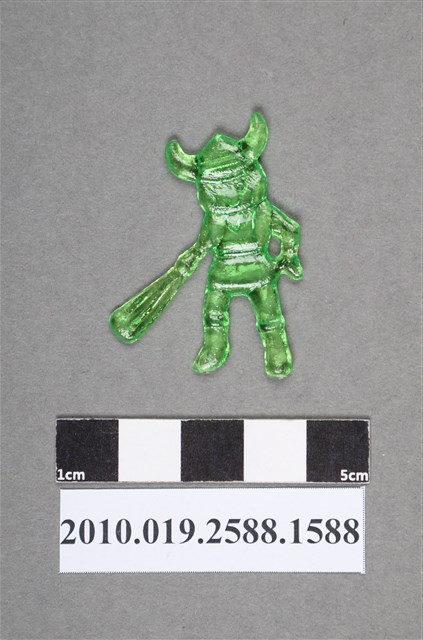 1.本物件為卡通北海小英雄之小威尪仔仙。硬質塑膠材質,扁平,單一綠色,雙面浮雕圖案。正面圖案為頭戴維京人帽子,腳穿靴子,左手拿棒子之男孩貌。