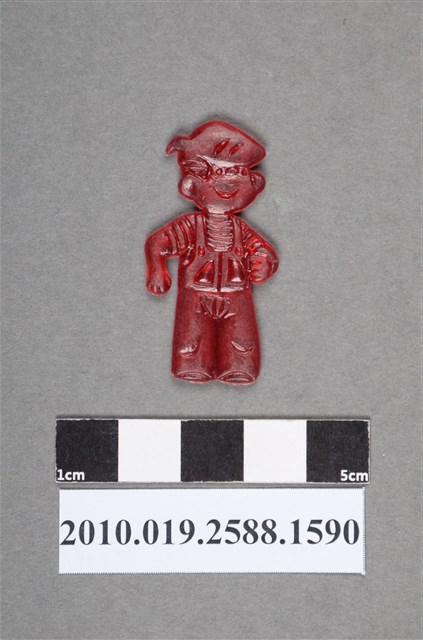 1.本物件為卡通淘氣阿丹之阿丹尪仔仙。硬質塑膠材質,扁平,單一紅色,雙面浮雕圖案,兩面圖案相同。圖案為站立的阿丹,穿著吊帶褲和橫條紋上衣,一手在前,一手在後。