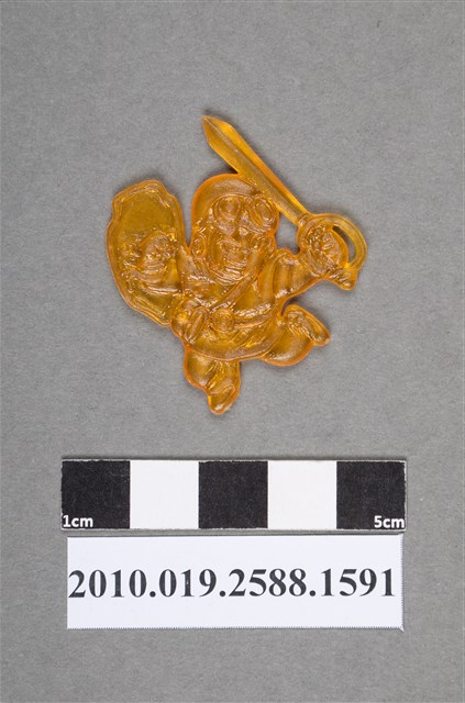 1.本物件為持劍盾人型尪仔仙。硬質塑膠材質,扁平,單一橙色,雙面浮雕圖案,兩面圖案相同。圖案為戰鬥的人型,其頭戴安全帽,安全帽上有飛行眼鏡,身穿大外套,斜揹某物,一手拿盾牌,一手舉著長劍,雙腳有跳躍貌。