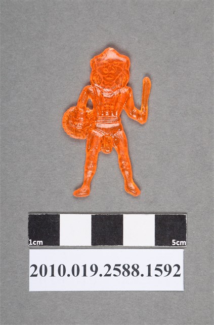 1.本物件為古裝武俠劇金獅王之金獅王尪仔仙。硬質塑膠材質,扁平,單一橘色,雙面浮雕圖案。正面圖案為戰鬥的獅頭人身,其頭部是獅臉,有鬃毛,胸前有裝飾,腰間有垂掛物品至大腿高度,右手拿刀,左手拿圓盾。