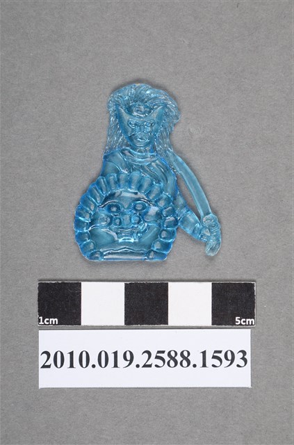 1.本物件為古裝武俠劇金獅王之金獅王尪仔仙。硬質塑膠材質,扁平,單一藍色,雙面浮雕圖案,兩面圖案相同。圖案為半身像,其臉部帶有半截面具,遮住眼部,頭髮略長,一手拿刀,一手拿盾,盾面有獅臉之貌,外圈由塊狀組成,似鬃毛之樣。