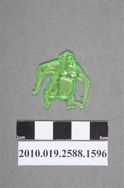 1.本物件為紅毛猩猩尪仔仙。硬質塑膠材質,扁平,單一綠色,雙面浮雕圖案,兩面圖案相同。圖案為走路的紅毛猩猩,無特殊表情,肚子圓滾,雙手一前一後,雙腳一前一後,呈走路姿勢。
