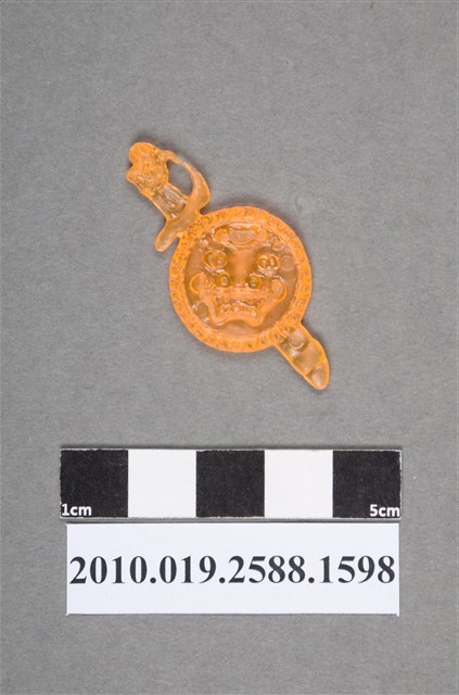 1.本物件為古裝武俠劇金獅王之金獅王武器尪仔仙。硬質塑膠材質,扁平,單一橘色,雙面浮雕圖案,兩面圖案相同。圖案為1把刀和1個圓盾的組合,劍之握把有裝飾,插於劍鞘中,盾面有獅臉之貌,外圈由塊狀組成,似鬃毛之樣。在戲劇中,這個組合是主角金獅王的武器配備。