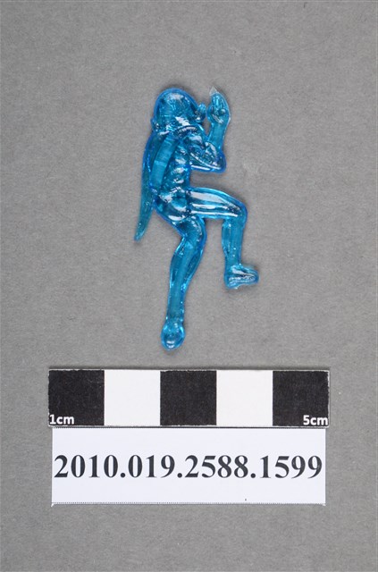 1.本物件為雙手交叉人型尪仔仙。硬質塑膠材質,扁平,單一黃色,雙面浮雕圖案。正面圖案為戴著頭盔身穿披風,雙手交叉於胸前,兩腳膝蓋微彎,擺出戰鬥姿勢的人型。2.尪仔仙尺寸大致可分成小、中、大型,小型約長2-5公分,中型約長8-15公分,顏色以單色為主。有些大型的則可長達30公分左右,以菩薩、神仙和民間傳說故事人物等造型為主,塗上金銀紅黃彩漆等亮色。1960、70年代的尪仔仙多以民間傳說故事、歌仔戲、布袋戲人物為造型。1980年代改以卡通、電玩、漫畫人物造型為主。常見玩法之一為兩人(或多人)各持一只尪仔仙,輪流用手指彈射,看誰的尪仔仙先疊在對方上面,便可贏得對方用來對戰或是約定的尪仔仙。