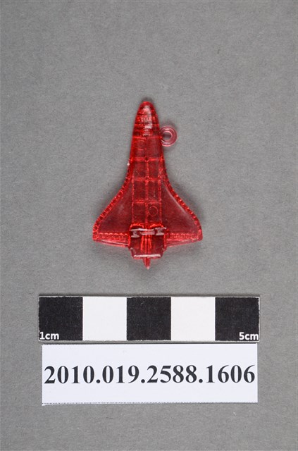 1.本物件為太空梭尪仔仙。硬質塑膠材質,扁平,單一紅色,雙面浮雕圖案。正面圖案為兩翼在尾端的太空梭,機身無特殊裝飾,太空梭尾部有噴射口,底部有有8格長方形構件。靠近太空梭前端有吊環。2.尪仔仙尺寸大致可分成小、中、大型,小型約長2-5公分,中型約長8-15公分,顏色以單色為主。有些大型的則可長達30公分左右,以菩薩、神仙和民間傳說故事人物等造型為主,塗上金銀紅黃彩漆等亮色。1960、70年代的尪仔仙多以民間傳說故事、歌仔戲、布袋戲人物為造型。1980年代改以卡通、電玩、漫畫人物造型為主。常見玩法之一為兩人(或多人)各持一只尪仔仙,輪流用手指彈射,看誰的尪仔仙先疊在對方上面,便可贏得對方用來對戰或是約定的尪仔仙。
