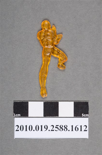 1.本物件為雙手交叉人型尪仔仙。硬質塑膠材質,扁平,單一橙色,雙面浮雕圖案。正面圖案為戴面具型頭盔遮住全頭部,雙手彎曲交叉在胸前呈十字型,右腳彎曲,左腳伸長,呈戰鬥姿勢。2.尪仔仙尺寸大致可分成小、中、大型,小型約長2-5公分,中型約長8-15公分,顏色以單色為主。有些大型的則可長達30公分左右,以菩薩、神仙和民間傳說故事人物等造型為主,塗上金銀紅黃彩漆等亮色。1960、70年代的尪仔仙多以民間傳說故事、歌仔戲、布袋戲人物為造型。1980年代改以卡通、電玩、漫畫人物造型為主。常見玩法之一為兩人(或多人)各持一只尪仔仙,輪流用手指彈射,看誰的尪仔仙先疊在對方上面,便可贏得對方用來對戰或是約定的尪仔仙。