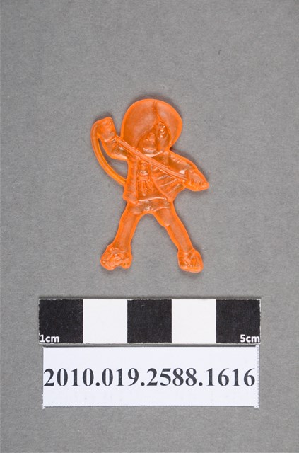 1.本物件為漫畫鬼太郎之鬼太郎尪仔仙。硬質塑膠材質,扁平,單一橘色,雙面浮雕圖案,兩面圖案相同。圖案為站立的鬼太郎,一邊頭髮蓋住眼睛,只露出1隻眼睛,穿著橫紋背心、短褲和日式木屐,雙手握住鞭子。