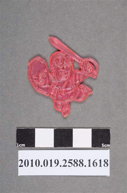 1.本物件為持劍盾人型尪仔仙。硬質塑膠材質,扁平,單一粉紅色,雙面浮雕圖案,兩面圖案相同。圖案為戰鬥的人型,其頭戴安全帽,安全帽上有飛行眼鏡,身穿大外套,斜揹某物,一手拿盾牌,一手舉著長劍,雙腳有跳躍貌。2.尪仔仙尺寸大致可分成小、中、大型,小型約長2-5公分,中型約長8-15公分,顏色以單色為主。有些大型的則可長達30公分左右,以菩薩、神仙和民間傳說故事人物等造型為主,塗上金銀紅黃彩漆等亮色。1960、70年代的尪仔仙多以民間傳說故事、歌仔戲、布袋戲人物為造型。1980年代改以卡通、電玩、漫畫人物造型為主。常見玩法之一為兩人(或多人)各持一只尪仔仙,輪流用手指彈射,看誰的尪仔仙先疊在對方上面,便可贏得對方用來對戰或是約定的尪仔仙。