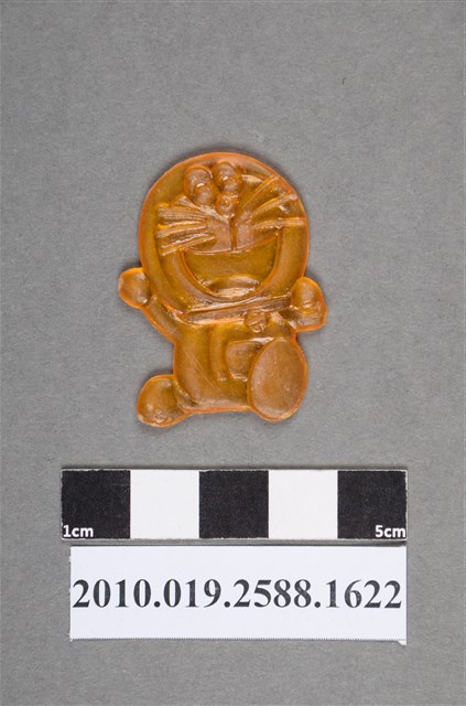 1.本物件為卡通哆啦A夢(小叮噹)之哆啦A夢尪仔仙。硬質塑膠材質,扁平,單一橙色,雙面浮雕圖案,兩面圖案相同。圖案為正在走路的哆啦A夢,左右臉頰上各有3根鬚,張嘴而笑,可見其脖子上有鈴鐺,肚子上有百寶袋,其雙手舉起,呈興高采烈走路貌。