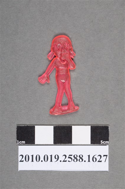 1.本物件為卡通哆啦A夢(小叮噹)之靜香尪仔仙。硬質塑膠材質,扁平,單一粉紅色,雙面浮雕圖案,兩面圖案相同。圖案為綁著2個馬尾的靜香站立,眼睛睜大,身穿內衣內褲,一手摀住嘴巴,一手向旁邊伸,呈驚訝貌。