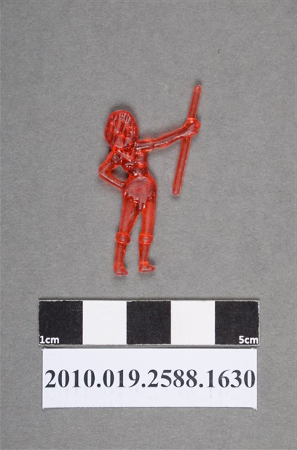 1.本物件為持棍人型尪仔仙。硬質塑膠材質,扁平,單一橘紅色,雙面浮雕圖案。正面圖案為女性人型,額頭上有裝飾品,頭髮長及肩,穿有短裙和靴子,其左手撐腰,右手拿著1枝長棍。2.尪仔仙尺寸大致可分成小、中、大型,小型約長2-5公分,中型約長8-15公分,顏色以單色為主。有些大型的則可長達30公分左右,以菩薩、神仙和民間傳說故事人物等造型為主,塗上金銀紅黃彩漆等亮色。1960、70年代的尪仔仙多以民間傳說故事、歌仔戲、布袋戲人物為造型。1980年代改以卡通、電玩、漫畫人物造型為主。常見玩法之一為兩人(或多人)各持一只尪仔仙,輪流用手指彈射,看誰的尪仔仙先疊在對方上面,便可贏得對方用來對戰或是約定的尪仔仙。