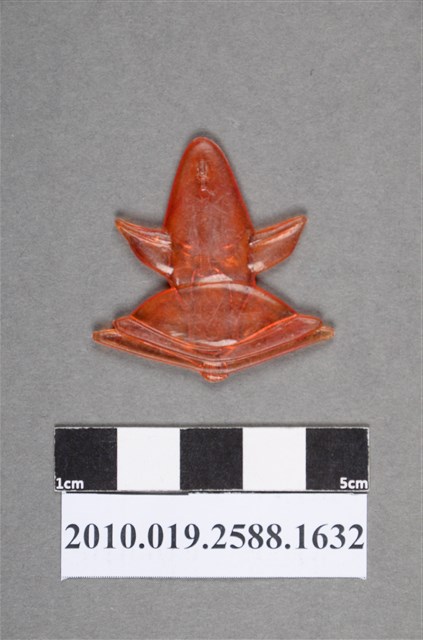 1.本物件為長下巴頭像尪仔仙。硬質塑膠材質,扁平,單一橘色,雙面浮雕圖案。正面圖案為長臉頭像,頭頂尖長,尖耳且外擴,長下巴,下巴底下可見服裝的一部分。2.尪仔仙尺寸大致可分成小、中、大型,小型約長2-5公分,中型約長8-15公分,顏色以單色為主。有些大型的則可長達30公分左右,以菩薩、神仙和民間傳說故事人物等造型為主,塗上金銀紅黃彩漆等亮色。1960、70年代的尪仔仙多以民間傳說故事、歌仔戲、布袋戲人物為造型。1980年代改以卡通、電玩、漫畫人物造型為主。常見玩法之一為兩人(或多人)各持一只尪仔仙,輪流用手指彈射,看誰的尪仔仙先疊在對方上面,便可贏得對方用來對戰或是約定的尪仔仙。