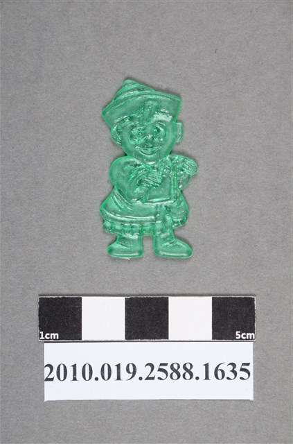 1.本物件為殭屍尪仔仙。硬質塑膠材質,扁平,單一綠色,雙面浮雕圖案,兩面圖案相同。圖案為Q版殭屍,戴有官帽,官帽上貼有1張符咒,身穿朝服,雙手往前舉起。