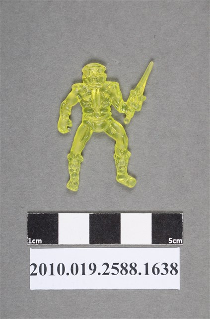 1.本物件為持劍人型尪仔仙。硬質塑膠材質,扁平,單一黃色,雙面浮雕圖案,兩面圖案相同。圖案為戴著頭盔的人型,服裝具戰鬥風格,有腰帶、護肩和靴子,一手握著劍型武器。2.尪仔仙尺寸大致可分成小、中、大型,小型約長2-5公分,中型約長8-15公分,顏色以單色為主。有些大型的則可長達30公分左右,以菩薩、神仙和民間傳說故事人物等造型為主,塗上金銀紅黃彩漆等亮色。1960、70年代的尪仔仙多以民間傳說故事、歌仔戲、布袋戲人物為造型。1980年代改以卡通、電玩、漫畫人物造型為主。常見玩法之一為兩人(或多人)各持一只尪仔仙,輪流用手指彈射,看誰的尪仔仙先疊在對方上面,便可贏得對方用來對戰或是約定的尪仔仙。
