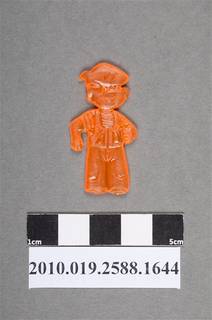 1.本物件為卡通淘氣阿丹之阿丹尪仔仙。硬質塑膠材質,扁平,單一橘色,雙面浮雕圖案,兩面圖案相同。圖案為站立的阿丹,穿著吊帶褲和橫條紋上衣,一手在前,一手在後。