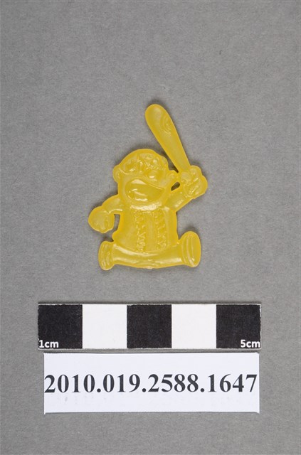 1.本物件為卡通哆啦A夢(小叮噹)之胖虎尪仔仙。硬質塑膠材質,扁平,單一黃色,雙面浮雕圖案,兩面圖案相同。圖案為生氣的胖虎,臉部表情生氣,嘴巴張大,上衣有2條直條紋。其一手握著棒球棒,另一手握拳,雙腳幾乎呈直線狀,呈走路速度快之感。