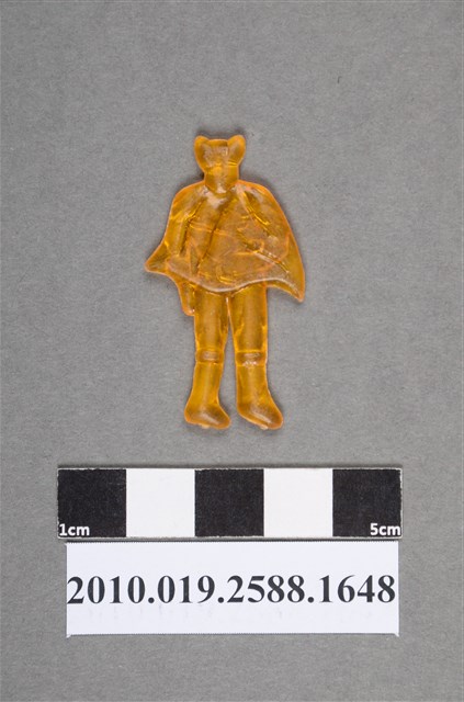 1.本物件為披風人型尪仔仙。硬質塑膠材質,扁平,單一橙色,雙面浮雕圖案。正面圖案為男性站立人型,戴有頭盔,身上有披風,披風長度至臀部,穿有手套和靴子。其右手放在腹部,左手自然垂放。2.尪仔仙尺寸大致可分成小、中、大型,小型約長2-5公分,中型約長8-15公分,顏色以單色為主。有些大型的則可長達30公分左右,以菩薩、神仙和民間傳說故事人物等造型為主,塗上金銀紅黃彩漆等亮色。1960、70年代的尪仔仙多以民間傳說故事、歌仔戲、布袋戲人物為造型。1980年代改以卡通、電玩、漫畫人物造型為主。常見玩法之一為兩人(或多人)各持一只尪仔仙,輪流用手指彈射,看誰的尪仔仙先疊在對方上面,便可贏得對方用來對戰或是約定的尪仔仙。