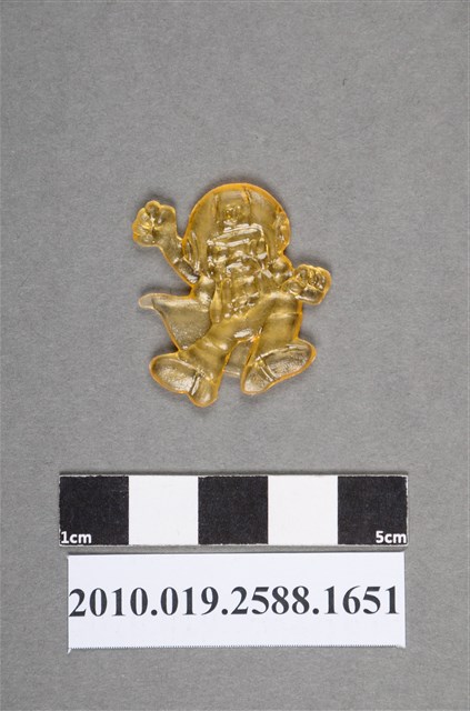 1.本物件為握拳人型尪仔仙。硬質塑膠材質,扁平,單一黃色,雙面浮雕圖案,兩面圖案相同。圖案為跳躍的人型,其戴著頭盔,身穿有披風和靴子,一手握拳向上舉,一手握拳往下擺,一腳伸直,一腳膝蓋彎曲。2.尪仔仙尺寸大致可分成小、中、大型,小型約長2-5公分,中型約長8-15公分,顏色以單色為主。有些大型的則可長達30公分左右,以菩薩、神仙和民間傳說故事人物等造型為主,塗上金銀紅黃彩漆等亮色。1960、70年代的尪仔仙多以民間傳說故事、歌仔戲、布袋戲人物為造型。1980年代改以卡通、電玩、漫畫人物造型為主。常見玩法之一為兩人(或多人)各持一只尪仔仙,輪流用手指彈射,看誰的尪仔仙先疊在對方上面,便可贏得對方用來對戰或是約定的尪仔仙。