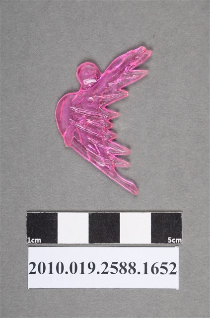 1.本物件為卡通科學小飛俠之鐵雄尪仔仙。硬質塑膠材質,扁平,單一粉紅色,雙面浮雕圖案。正面圖案為跳飛起來的鐵雄,戴著頭盔,右手揚起鳥羽狀披風,右膝蓋抬起,左腳伸直。