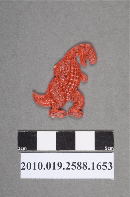 1.本物件為橘紅色恐龍型尪仔仙。硬質塑膠材質,扁平,單一橘紅色,雙面浮雕圖案,兩面圖案相同。圖案為站立的恐龍,張嘴,身上布滿小凹洞,腹部表面有方格形,上肢短小,尾巴短。