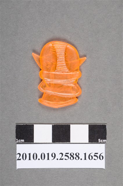 1.本物件為頭盔頭像尪仔仙。硬質塑膠材質,扁平,單一橘色,雙面浮雕圖案。正面圖案為戴著面具型頭盔遮住全頭部,兩側太陽穴有突出尖角裝飾,橫型構件蓋住臉頰和鼻子之包括脖子部分頭像。