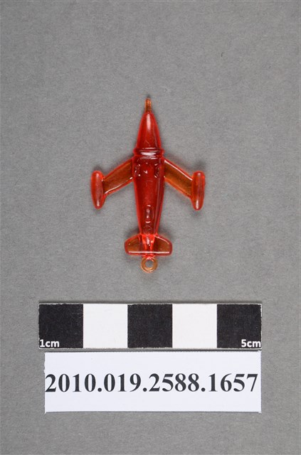 1.本物件為飛機尪仔仙。硬質塑膠材質,扁平,單一紅色,雙面浮雕圖案。飛機構造有兩側機翼、尾翼,機頭前方有尖狀物。尪仔仙有吊環在尾翼。2.尪仔仙尺寸大致可分成小、中、大型,小型約長2-5公分,中型約長8-15公分,顏色以單色為主。有些大型的則可長達30公分左右,以菩薩、神仙和民間傳說故事人物等造型為主,塗上金銀紅黃彩漆等亮色。1960、70年代的尪仔仙多以民間傳說故事、歌仔戲、布袋戲人物為造型。1980年代改以卡通、電玩、漫畫人物造型為主。常見玩法之一為兩人(或多人)各持一只尪仔仙,輪流用手指彈射,看誰的尪仔仙先疊在對方上面,便可贏得對方用來對戰或是約定的尪仔仙。