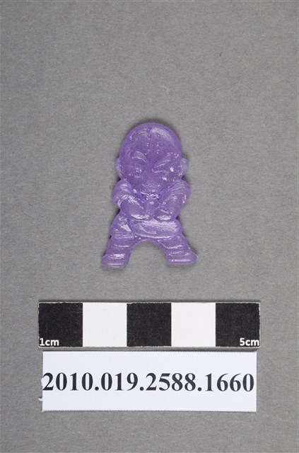 1.本物件為漫畫七龍珠之克林尪仔仙。硬質塑膠材質,扁平,單一紫色,雙面浮雕圖案,兩面圖案相同。克林頭上有6道戒疤,眉毛粗,袖子挽起來,雙手有摩拳擦掌之勢。