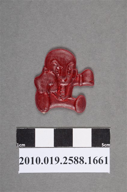 1.本物件為拳擊人型尪仔仙。硬質塑膠材質,扁平,單一不透明紅色,雙面浮雕圖案,兩面圖案相同。圖案為光頭男生,眉毛明顯,呈坐姿,雙手握拳,有一拳往前擊。2.尪仔仙尺寸大致可分成小、中、大型,小型約長2-5公分,中型約長8-15公分,顏色以單色為主。有些大型的則可長達30公分左右,以菩薩、神仙和民間傳說故事人物等造型為主,塗上金銀紅黃彩漆等亮色。1960、70年代的尪仔仙多以民間傳說故事、歌仔戲、布袋戲人物為造型。1980年代改以卡通、電玩、漫畫人物造型為主。常見玩法之一為兩人(或多人)各持一只尪仔仙,輪流用手指彈射,看誰的尪仔仙先疊在對方上面,便可贏得對方用來對戰或是約定的尪仔仙。