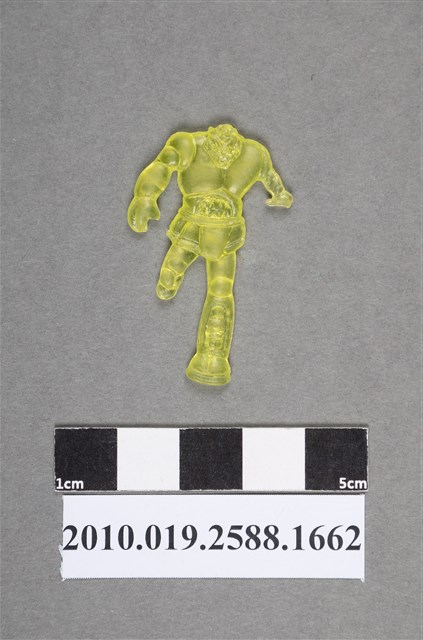 1.本物件為黃色機器人型尪仔仙。硬質塑膠材質,扁平,單一黃色,雙面浮雕圖案,兩面圖案相同。圖案為跑步的機器人型,腹部有半圓形圖紋,呈一手往前擺,一手往後擺,一腳往後騰空,一腳站立之姿勢。