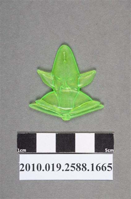 1.本物件為長下巴頭像尪仔仙。硬質塑膠材質,扁平,單一綠色,雙面浮雕圖案。正面圖案為長臉頭像,頭頂尖長,尖耳且外擴,長下巴,下巴底下可見服裝的一部分。2.尪仔仙尺寸大致可分成小、中、大型,小型約長2-5公分,中型約長8-15公分,顏色以單色為主。有些大型的則可長達30公分左右,以菩薩、神仙和民間傳說故事人物等造型為主,塗上金銀紅黃彩漆等亮色。1960、70年代的尪仔仙多以民間傳說故事、歌仔戲、布袋戲人物為造型。1980年代改以卡通、電玩、漫畫人物造型為主。常見玩法之一為兩人(或多人)各持一只尪仔仙,輪流用手指彈射,看誰的尪仔仙先疊在對方上面,便可贏得對方用來對戰或是約定的尪仔仙。
