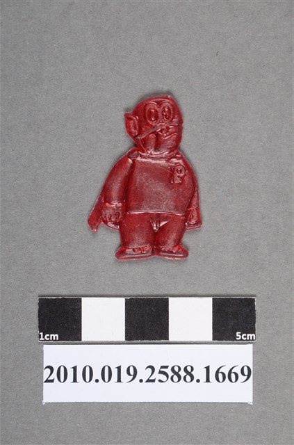 1.本物件為漫畫小超人帕門之胖超人尪仔仙。硬質塑膠材質,扁平,單一紅色,雙面浮雕圖案,兩面圖案相同。圖案為胖男孩戴頭盔之形象,其嘴巴微嘟,有披風,胸前有個P字,雙手自然垂放。